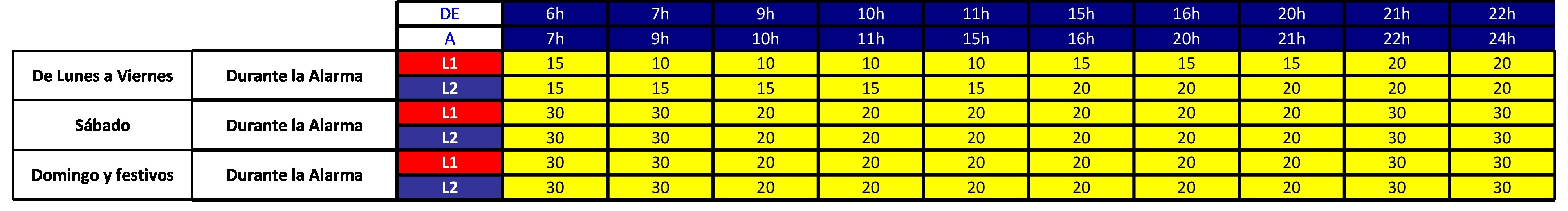 Por otro lado, las frecuencias del servicio diurno para los sábados, domingos y festivos, tanto en la Línea 1 como en la Línea 2, serán de 30 minutos de 06:00 a 09:00 horas, para a continuación hacerlo cada 20 minutos hasta las 21:00 horas, y posteriormente cada 30 minutos hasta la finalización del servicio a medianoche.
