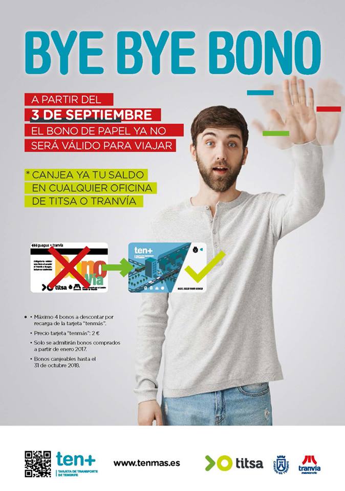 Los usuarios, que aún dispongan de saldo en estos bonos magnéticos, tienen la opción de canjearlos en las oficinas comerciales de Metrotenerife y TITSA hasta el 31 de octubre de 2018. Solo se podrá canjear bonos adquiridos a partir de enero de 2017 y un máximo de cuatro por persona. El saldo se descontará de la recarga de la tarjeta ten+.