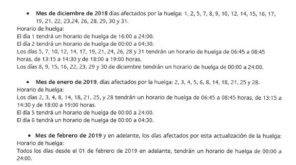Les recordamos el calendario de huelga para el presente mes de diciembre, enero y febrero: