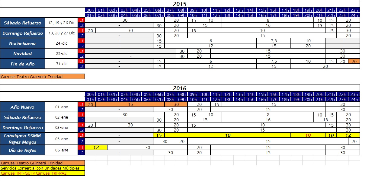Los sábados (días 19 y 26 de diciembre y el 02 de enero), los tranvías incrementarán su frecuencia a 8 minutos, desde las 12:00 horas hasta las 20:00 horas, y los domingos (días 20 y 27 diciembre y 3 de enero) a 10 minutos, entre las 10:00 y las 21:00 horas. Durante el resto del servicio, la red tranviaria operará con su habitual horario de fin de semana.